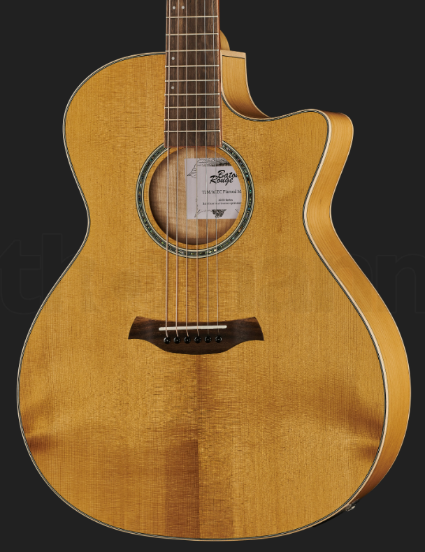 BATON ROUGE TLM/ACEC Flamed Maple – электроакустическая гитара профессионального уровня в корпусе Dreadnought. Инструмент обладает глубоким и выразительным звучанием и станет отличным вариантом не только для профессиональных музыкантов, но и для тех, кто не любит компромиссы и привык начинать с лучшего! Верхняя дека выполнена из массива немецкой ели, задняя дека и обечайка – из огненного клена. Данное сочетание материалов делает тембр гитары читаемым и звонким. Гриф изготовлен из клена, накладка грифа и бридж – из эвкалипта. У гитары 20 ладов, а верхний и нижний порожек выполнены из кости, что способствует более насыщенному и яркому звучанию.