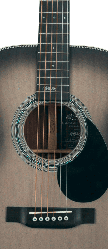 Гитара Martin Guitars OMJM John Mayer 20th в блестящей отделке Platinum Gray Burst имеет корпус формы Orchestra. Верхняя дека выполнена из ели, а спинка и обечайка из восточноиндийского палисандра. Гриф из красного дерева с профилем Low Profile соединён с кузовом креплением «ласточкин хвост» на уровне четырнадцатого лада. Накладка из чёрного дерева оснащена мензурой 25,4 дюйма, верхним порожком из кости шириной 42,86 мм и 20 ладами с перламутровыми вставками.
