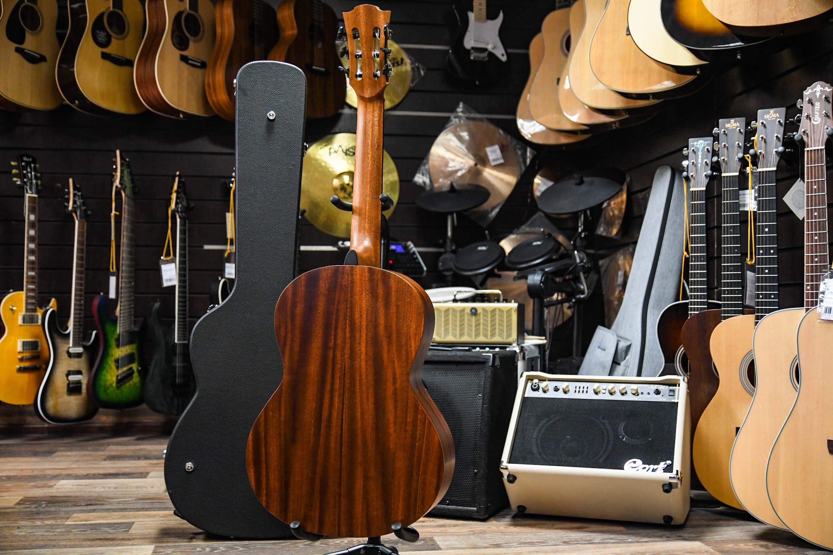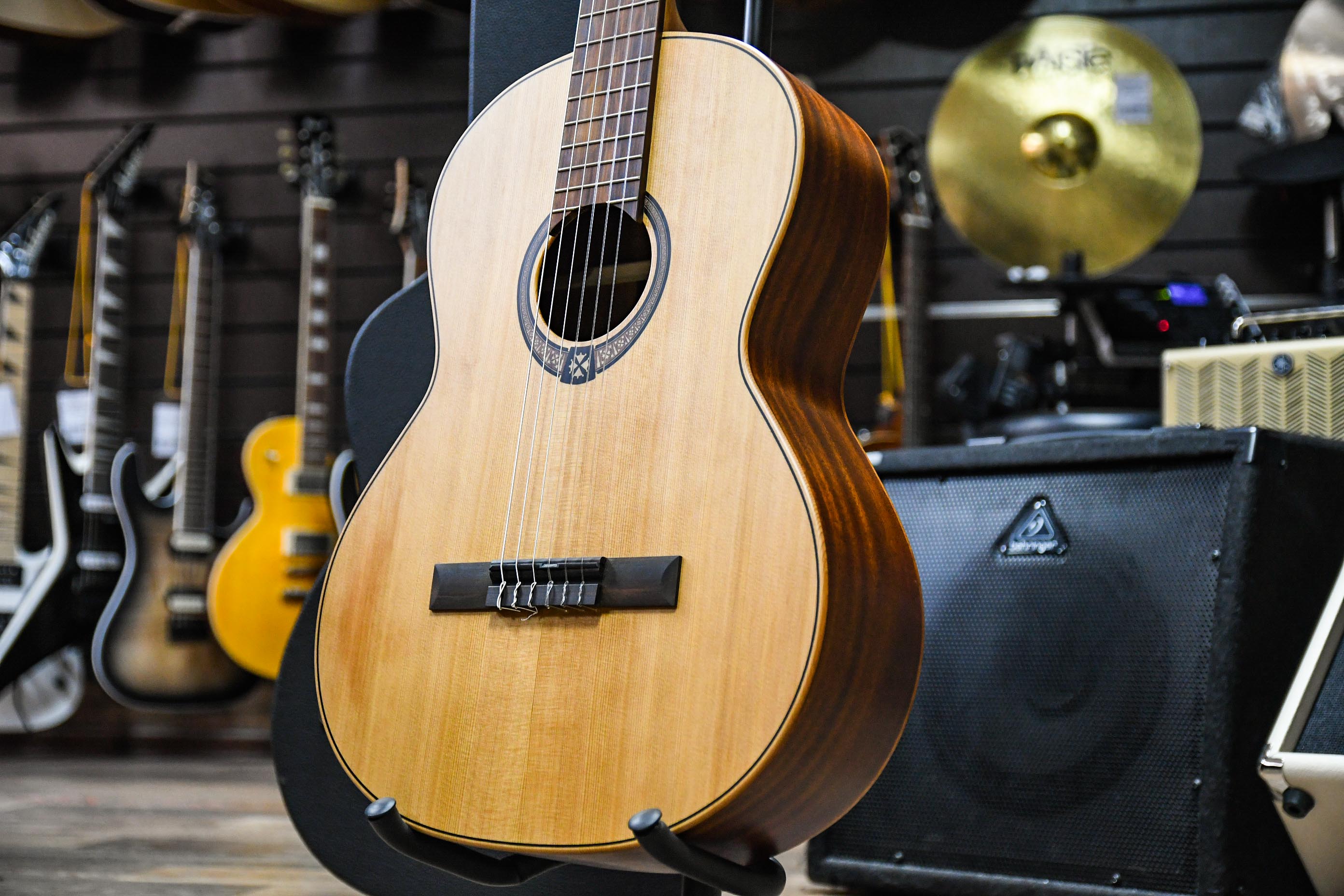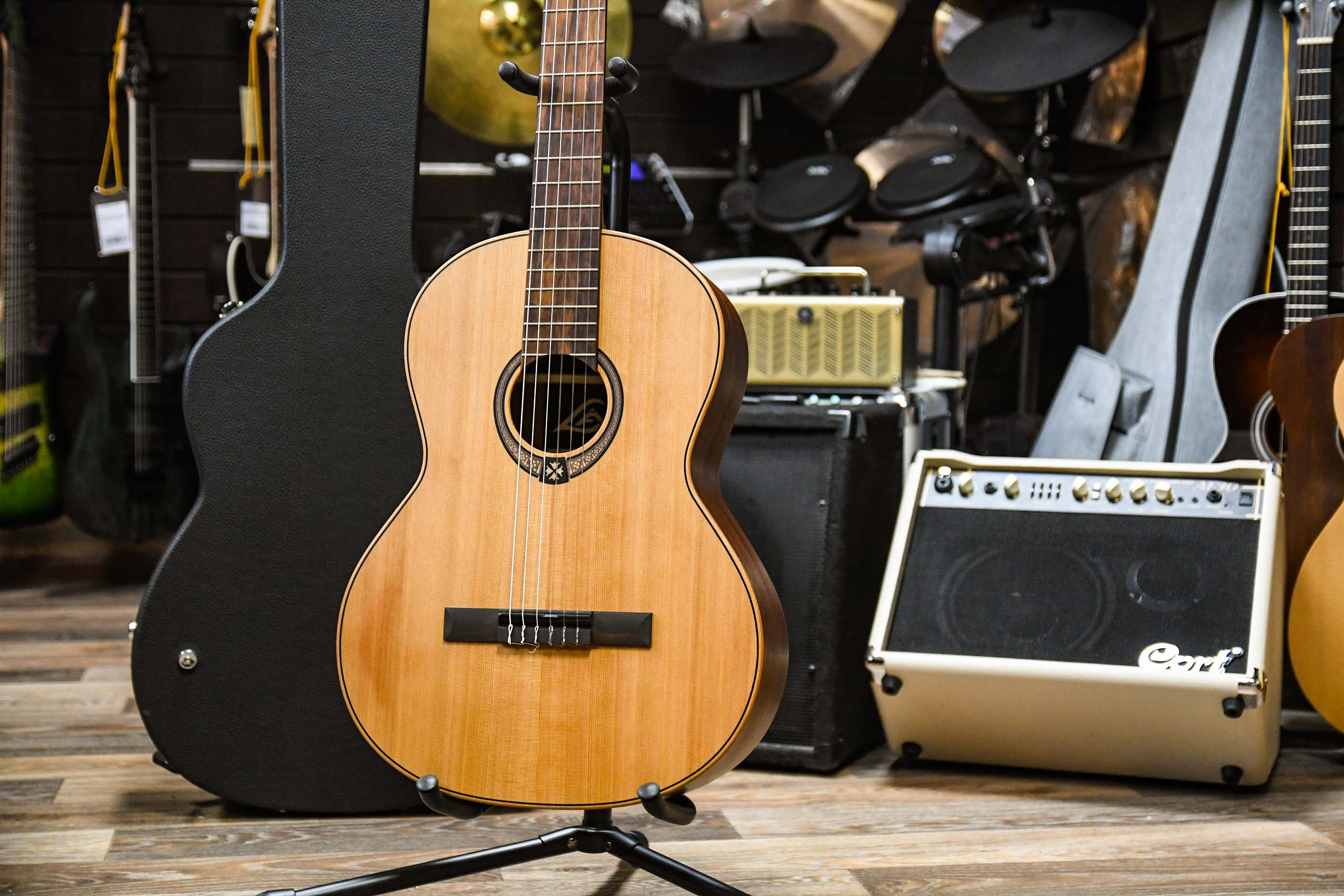 Гитара выполнена из массива кедра имеет теплый и глубокий звук с фокусировкой на средних частотах, а матовое покрытие помогает усилить эти свойства, добавляя насыщенность звучанию, что делает гитару подходящей как для классического стиля музыки, так и для других.