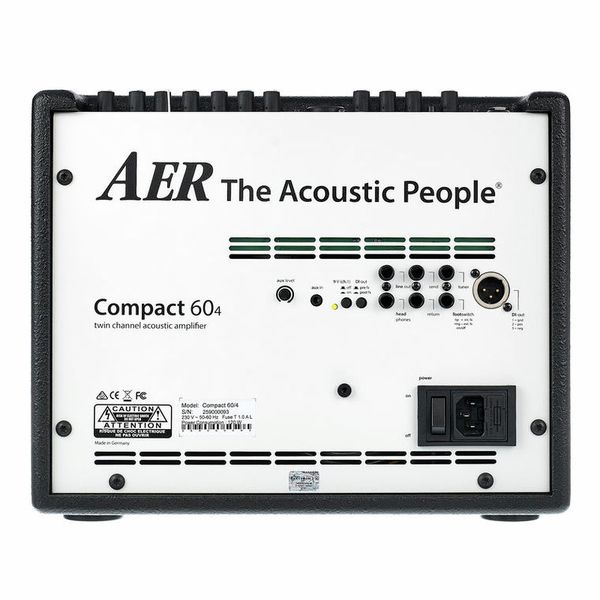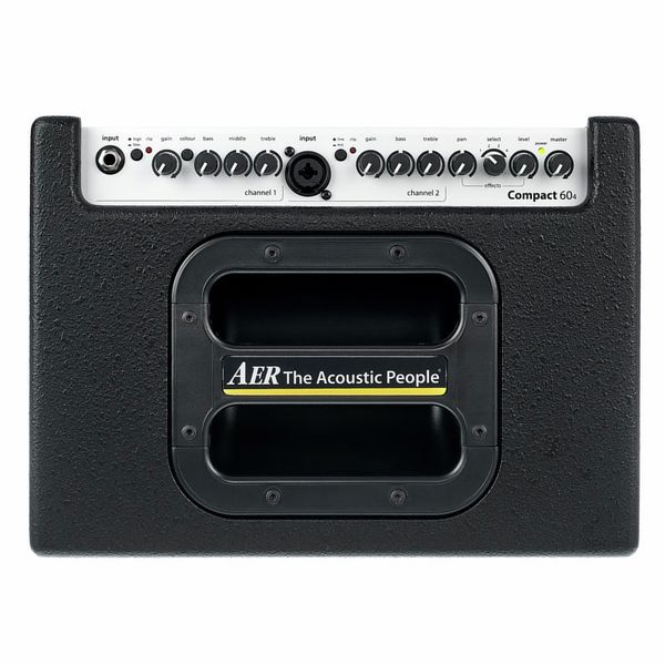 Модель 2018 года, AER Compact 60-4 имеет два независимых канала: Ch 1 - 6.3 мм (1/4) Jack - линейный вход с высоким сопротивлением, подавлением сигнала "PAD", регулировкой уровния сигнала и переключателем фантомного питания 9V. Ch 2 - комбинированный XLR/6.3 мм (1/4) Jack - высококачественный линейный или сбалансированный микрофонный вход с фантомным питанием 48В/9В и регулировкой уровня сигнала.